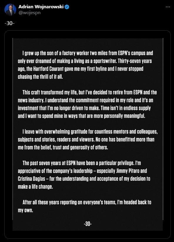 直播吧9月18日讯 1年前的今天,名记Adrian Wojnarowski发文宣布结束自己30年的记者生涯,宣布退休!“我是一名工厂工人的儿子,在距离ESPN校园两英里的地方长大,我一直梦想着以体育记者的身份谋生。37年前,哈特福德新闻报(Hartford Courant)给了我第一份工作,我从未停止对一切新闻的追求。“这份工作改变了我的生活,但我决定从ESPN和新闻行业退休。我理解我的角色所要承担的责任。这是一项我不再被迫做出的投资。时间是无尽的,我想以更有个人意义的方式度过我的时间。“我怀着无比的感激之情离开,感谢无数的导师和同事、学科、学者、读者和观众。没有人比我更受益于你们的信任和崇拜。“在ESPN度过的七年是一种眷顾。公司的领导层,尤其是吉米-皮塔罗和克里斯蒂娜-道格拉斯,他们理解并接受了我改变生活的决定。这么多年来我一直在报道别人/别的团队,现在我要报道我自己了。”Woj这样写道。