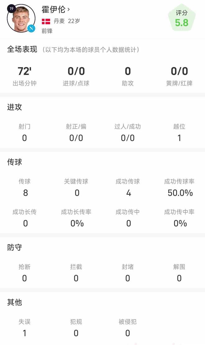 雷速体育9月19日讯 北京时间今天凌晨,在欧冠联赛阶段首轮比赛中,那不勒斯客场0比2不敌曼城。丹麦前锋霍伊伦首发出场,但表现平平,未能对比赛产生实质影响。