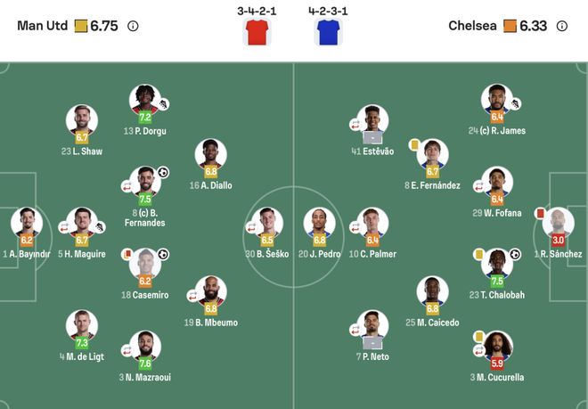 曼联(3421):1-巴因迪尔;4-德里赫特,5-马奎尔(70’15-约罗),23-卢克肖;3-马兹拉维(63’10-库尼亚),18-卡塞米罗,8-B费(87’37-梅努),13-多古;19-姆伯莫(70’7-芒特),16-迪亚洛;30-谢什科(46’25-乌加特)