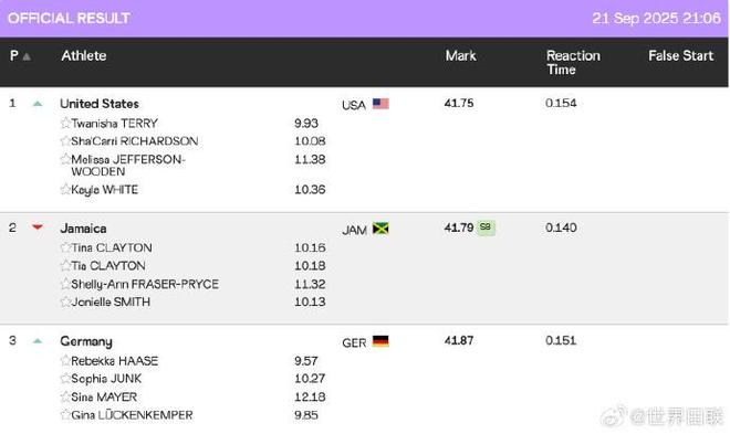 9月21日,2025年东京田径世锦赛女子4x100米接力决赛,比赛在大雨中进行,美国队41秒75获得金牌,牙买加队41秒79拿到银牌,德国队41秒87获得铜牌。牙买加最后一棒史密斯几乎完成终点线前的瞬移,但最后一棒理查德森守住优势夺冠。
