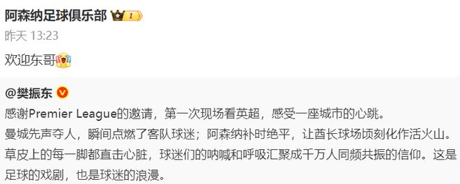 阿森纳俱乐部也做出了回应:“欢迎东哥。”感觉阿森纳俱乐部的回应不够给力啊。这么好的宣传机会,竟然这么敷衍。这不浪费了一个很好的宣传机会吗?难道他们觉得自己的影响力够大了,无需借这样的势?