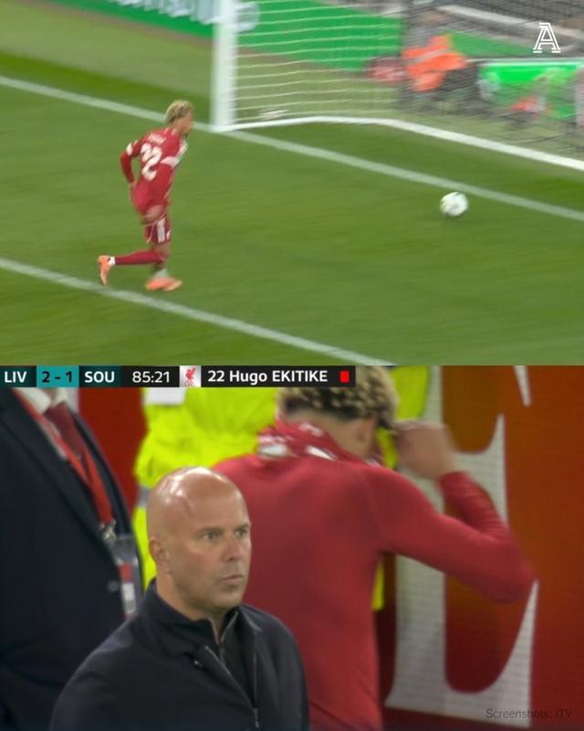 离谱!埃基蒂克脱衣庆祝将停赛,斯洛特有点生气瞪大了眼
