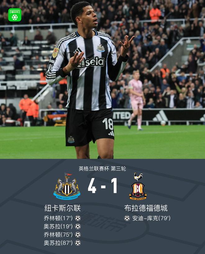 英联杯纽卡41布拉德福德城晋级,乔林顿、奥苏拉各入两球
