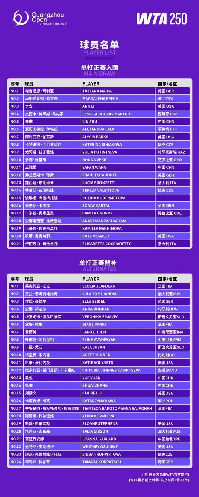 参赛名单中,朱琳、王雅繁两位金花入围,玛利亚、弗莱彻、伊埃拉、西尼亚科娃、普丁塞娃、维基奇等球员都将亮相。