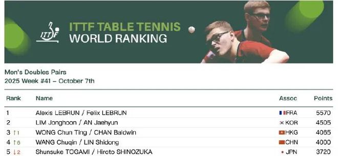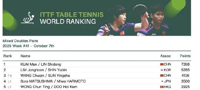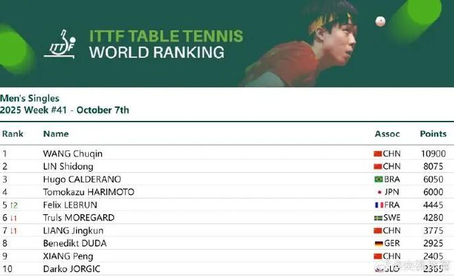 据央视新闻10月7日消息,今天,国际乒联公布2025年第41周世界排名。
