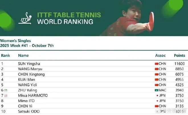 “万分女王”孙颖莎继续领跑世界排名
