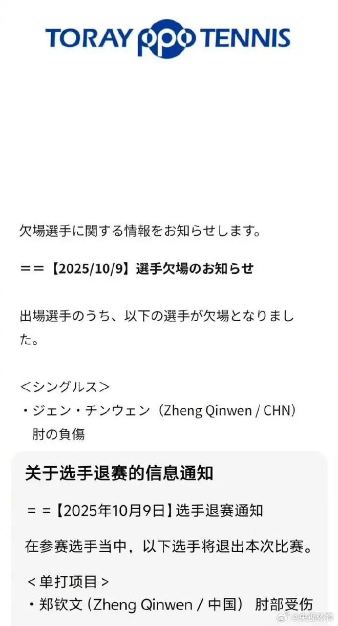 - 体育战报 | 郑钦文,退出WTA500东京站