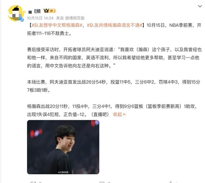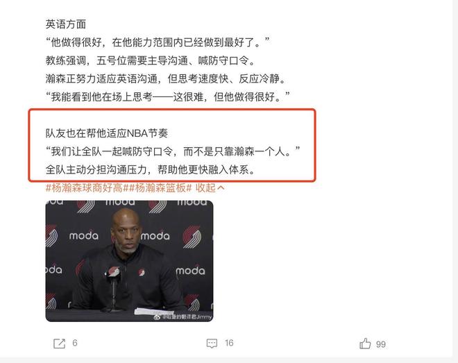 从最近半年的表现来看,我们当然不担心杨瀚森内向的问题,因为他的性格非常的活泼外向,平时在球队也会主动和教练以及队友们搭话,包括和老大哥之间的相处也非常的愉快。除此之外,在最近三场季前赛比赛结束之后,我们又得知了一些非常好的消息,杨瀚森在开拓者这边也是有大哥罩着的。首先根据此前球队记者透露的消息,包括阿夫迪亚以及利拉德这两位球队的大哥都正在努力学习中文。有一天早上,他们这两位国外球员居然在更衣室互相飙中文打招呼,这放在过往都是非常罕见的。
