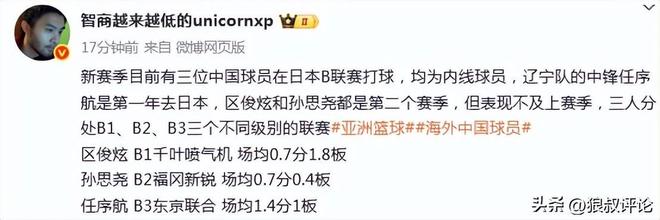 北京时间10月21日,根据媒体人“王健”的报道,新赛季目前有三位中国球员在日本B联赛打球,均为内线球员,辽宁队的中锋任序航是第一年去日本,区俊炫和孙思尧都是第二个赛季,但表现不及上赛季,三人分处B1、B2、B3三个不同级别的联赛。新赛季三人表现则是颇为惨淡,具体如下:区俊炫 B1千叶喷气机 场均0.7分1.8板孙思尧 B2福冈新锐 场均0.7分0.4板任序航 B3东京联合 场均1.4分1板