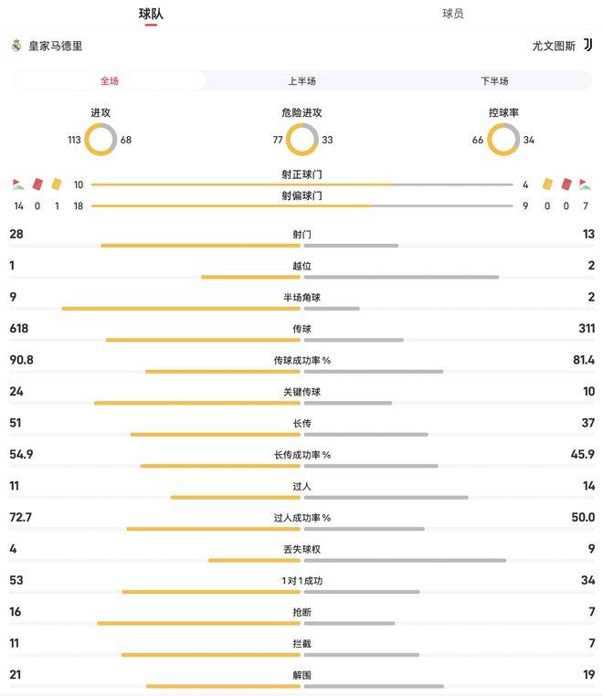 皇马vs尤文图斯全场数据:射门2813,控球率66%34%
