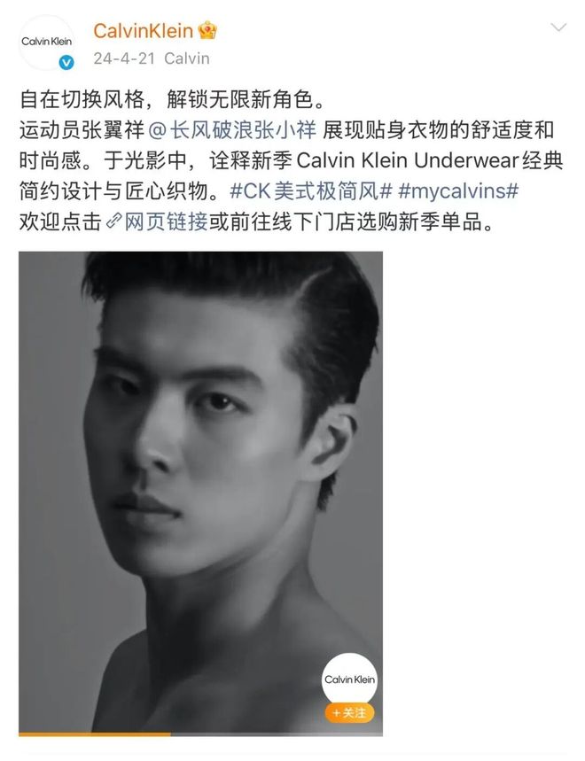 相同地还有浙江游泳队的张翼祥,被粉丝称为“小菜张”“国仰八”“老顺的阿贝贝”,却能活跃于CK、BURBERRY、Theory、adidas等品牌的商业活动,近期又以“天猫超级大满贯冲浪体验官”身份亮相“天猫造浪节”与一众明星同屏。这体现了另外一种品牌代言策略——颜值即正义。