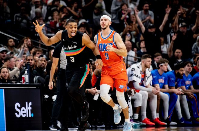 而雷霆的强势表现,让马刺的这两场胜利更具含金量。事实上,马刺本赛季的崛起确实得益于文班亚马的强势进化,赛季初的五场比赛,文班亚马场均能轰下30.2分14.6篮板4.8盖帽的恐怖数据,投篮命中率高达56.3%,成为近25年来继邓肯之后,唯一做到“30+14+4封盖”的联盟球员,也是NBA历史上第二位开季5胜0负且场均30+的中锋。此外,文班亚马的防守覆盖面积惊人,37%的盖帽发生在距离篮筐4米外的区域,甚至能完成封堵后撤步三分的惊人场面,马刺的比赛中经常可以看到进攻球员绕着文班走的滑稽场面。
