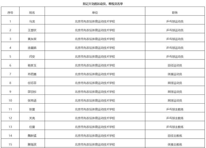 新京报讯 据体育北京官微消息,在第十五届全国运动会,北京体育健儿顽强拼搏、团结协作,圆满完成参赛任务,为首都体育事业再创佳绩。依据《北京市事业单位工作人员奖励实施办法》等文件规定,市人力资源社会保障局会同市体育局对在第十五届全国运动会上作出杰出贡献的北京运动员和教练员,开展记大功奖励工作。根据奖励工作部署,在有关单位积极推荐的基础上,经综合评审、统筹考虑,确定北京乒乓球运动队等9个集体,马龙等28位同志拟记大功对象。