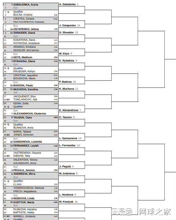 布里斯班赛同样看点十足:卡萨金娜与波塔波娃的首轮对决引人关注,而普利斯科娃的复出之战更是让人期待。赛事半决赛潜在对位也已浮出水面:头号种子萨巴伦卡可能与3号种子莱巴金娜狭路相逢,2号种子阿尼西莫娃则有望与4号种子佩古拉争夺决赛席位。这些对决无疑为澳网进行了精彩预演。