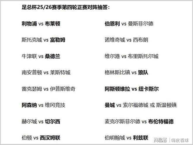 英格兰足总杯64强,已经完成了31场比赛,剩下一场延期举行。随后,32强的抽签揭晓,利物浦遇上曼联克星,切尔西、阿森纳和曼城等豪门,均遇上低级别球队,阿斯顿维拉和纽卡斯尔的运气相当糟糕,双方直接碰面,总是面对英超对手。