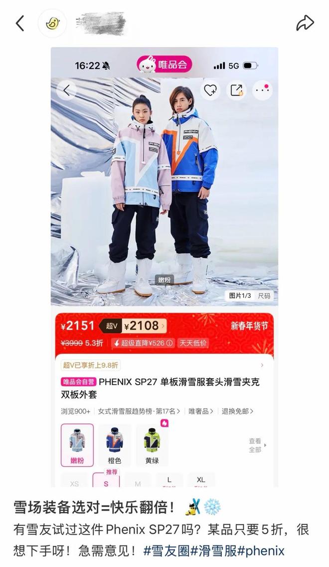 “滑雪的尽头是骨科,装备的尽头是折扣区。”兔子以往总在雪服店季末清仓时捡漏,但常遇断码。今年,她在朋友建议下到特卖平台上逛了一圈,发现一件收藏已久的Phenix SP27滑雪夹克,折扣后的价格相比原价几乎5折,于是果断拿下。
