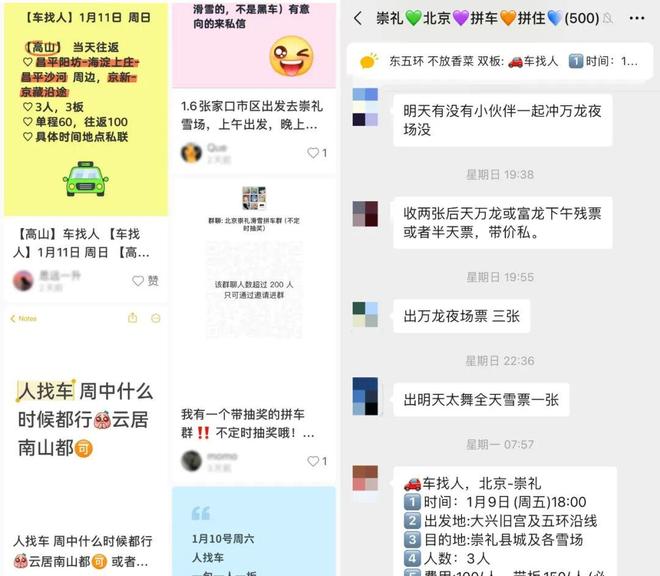 社交平台上寻找滑雪搭子、拼车拼房的信息